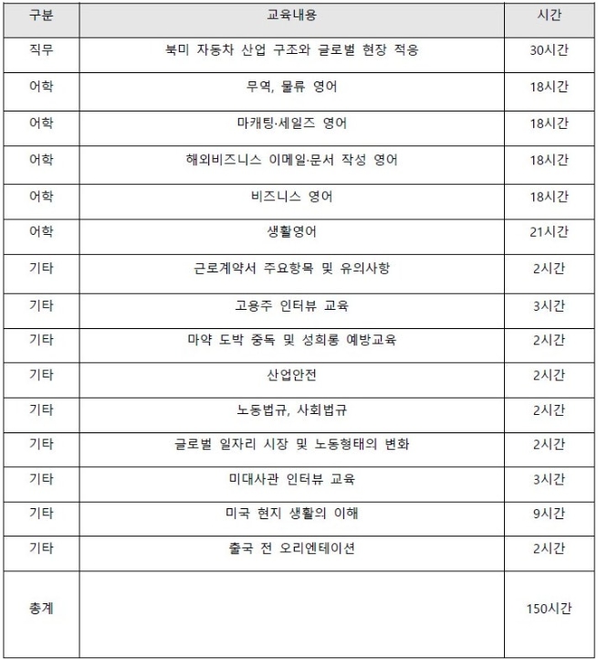 - 연수과정 종료 후 취업 국가 : ㈜동양이화산업 미국법인(조지아주, 앨라배마주에 위치)