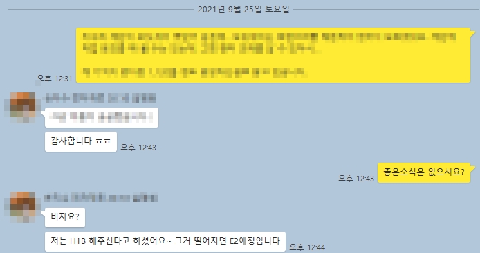 저희를 통하여 2021년 5월부터 근무를 시작한 손**님이 미국에서 취업비자 진행을 제안받았다는 좋은 소식이 들려왔습니다.