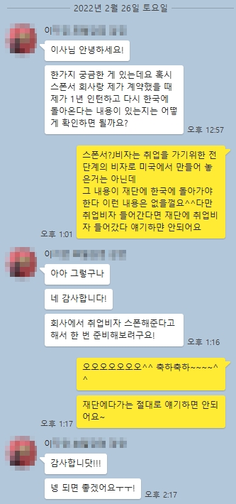저희를 통하여 21년 11월부터 근무를 시작한 이**님이 미국에서 취업비자 진행을 제안받았다는 좋은 소식이 들려왔습니다.
