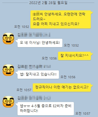 저희를 통하여 21년 8월부터 근무를 시작한 김**님이 미국에서 취업비자 진행을 제안받았다는 좋은 소식이 들려왔습니다.