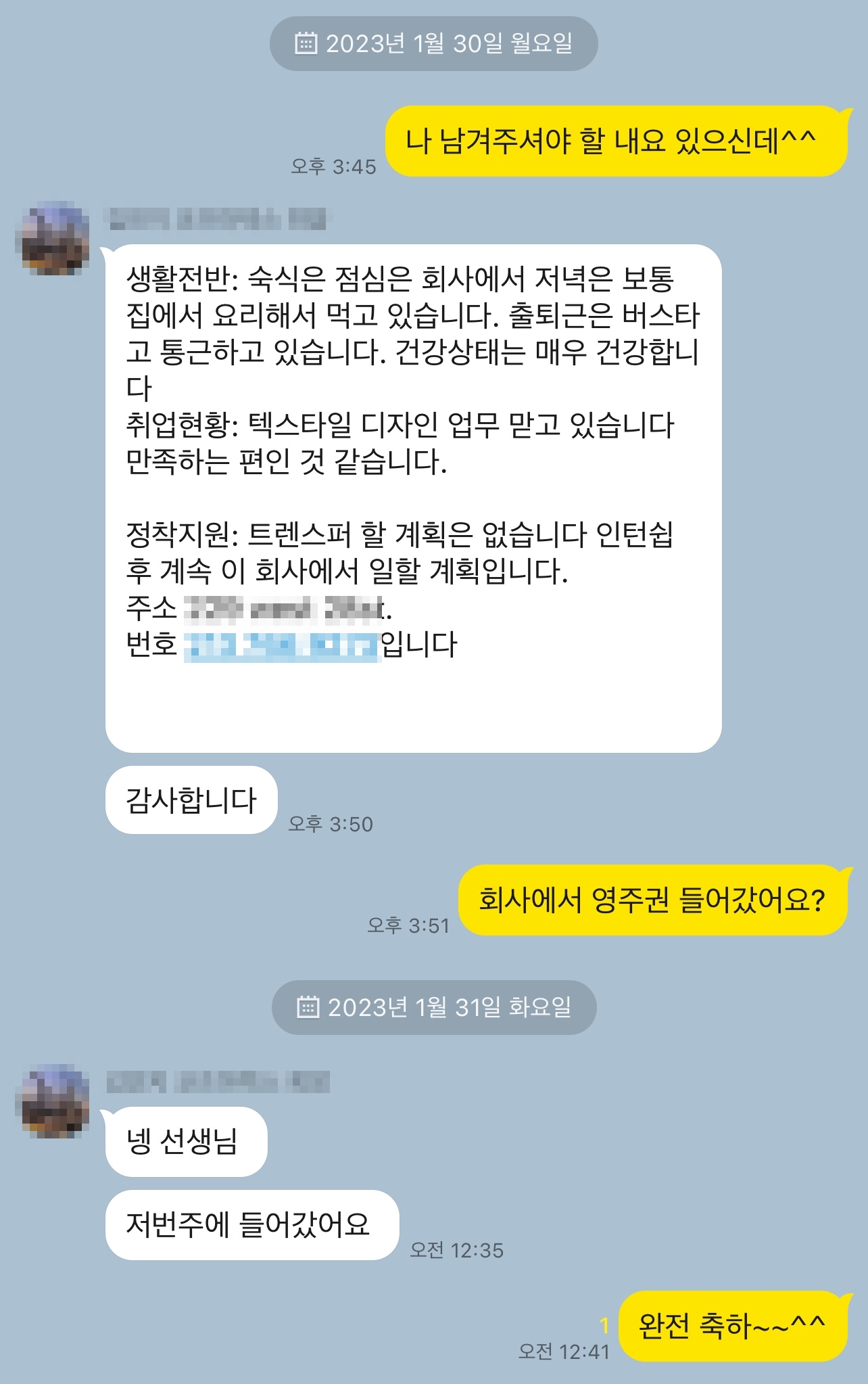 2022년 7월 18일 미국에서 근무를 시작한 친구인데, 금일 영주권 진행 소식을 전달해 주었습니다.