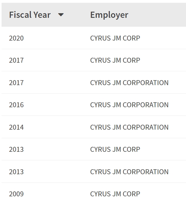 - 2009, 2013, 2014, 2016, 2017, 2020년 취업비자 스폰이력 확인.