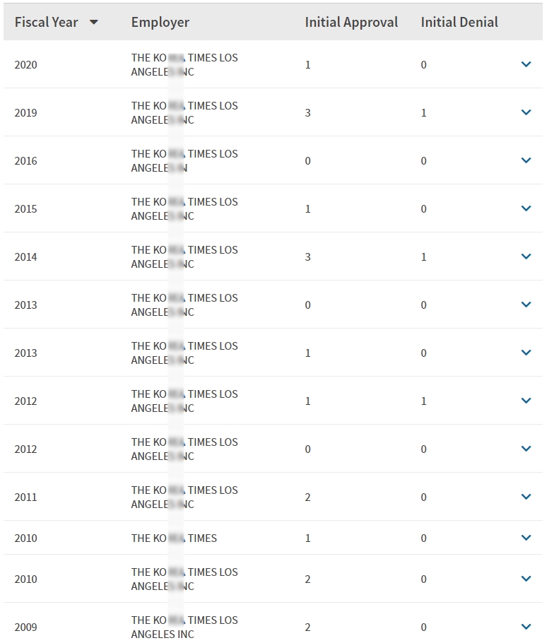- 2009, 2010, 2011, 2012, 2013, 2014, 2015, 2016, 2019, 2020년 취업비자 스폰이력 확인.